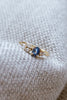 Een 18 karaat geel gouden ring bezet met een intens blauwe Ceylon saffier, omringd door 3 markies geslepen diamanten en een peervormige diamant.